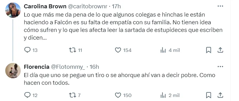 “Lo que más me da pena de lo que algunos colegas e hinchas le están haciendo a Falcón es su falta de empatía con su familia. No tienen idea cómo sufren y lo que les afecta leer la sartada de estupideces que escriben y dicen…”, le escribió la periodista Carolina Brown.