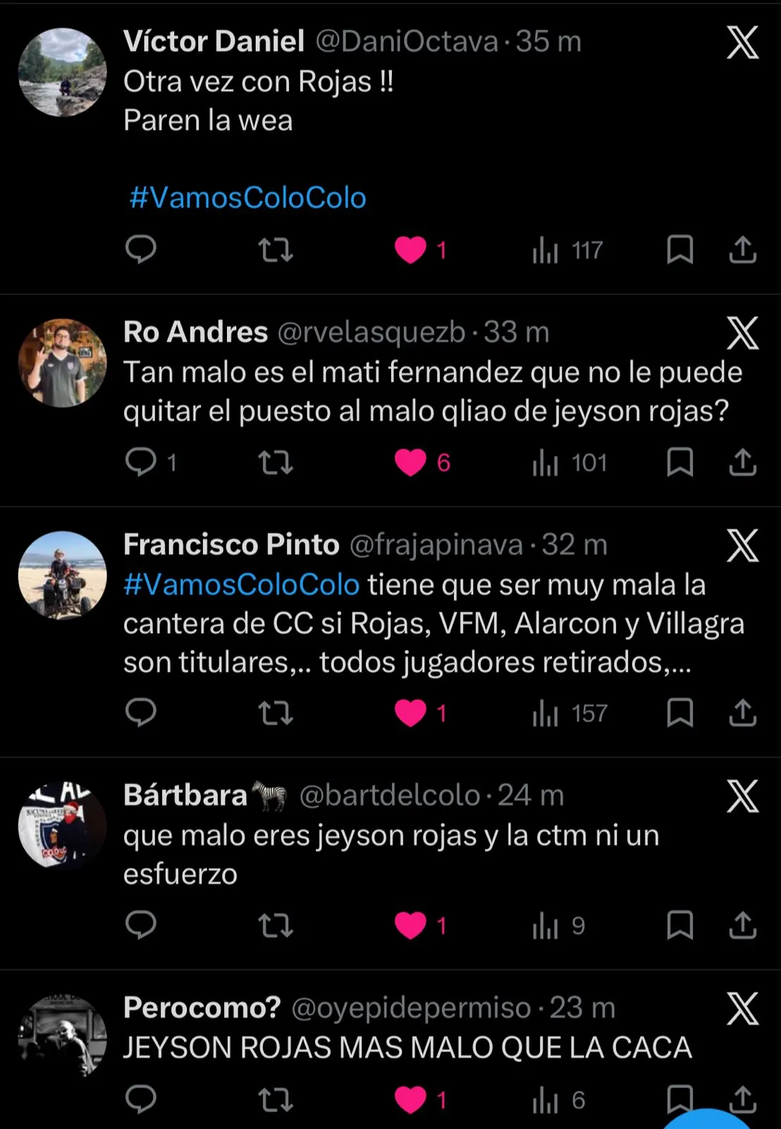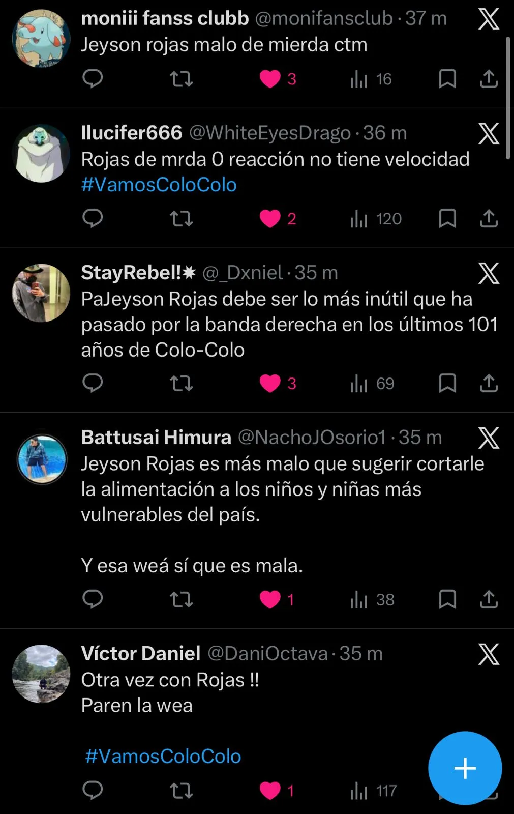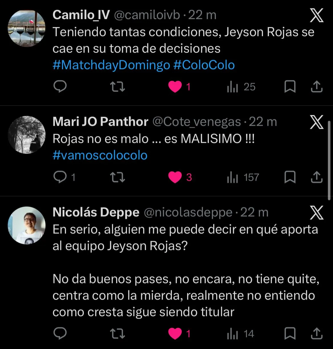 “Jeyson Rojas debe ser lo más inútil que ha pasado por la banda derecha en los últimos 101 años de Colo Colo”, agregó otro fanático.