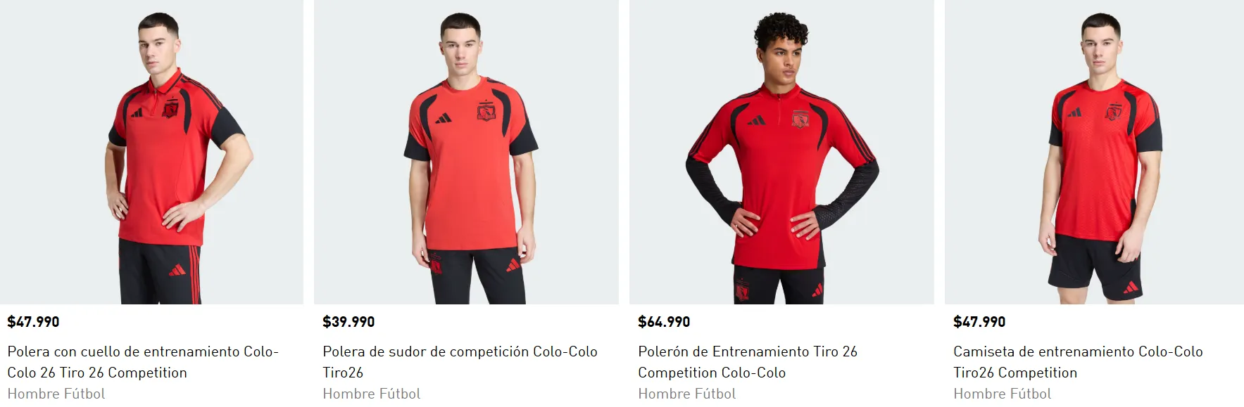 En la página web de la marca deportiva Adidas se pueden apreciar seis modelos distintos, poleras de entrenamiento, polera con cuello, polerón, chaqueta de presentación, pantalones de buzo y short.
