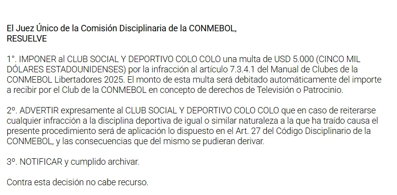 Semanas después de este suceso, en la CONMEBOL durante estos días hicieron respetar lo que es su manual y sancionaron a Colo Colo, propinándole un nuevo duro golpe a los ‘Albos’, acompañado de una importante advertencia.