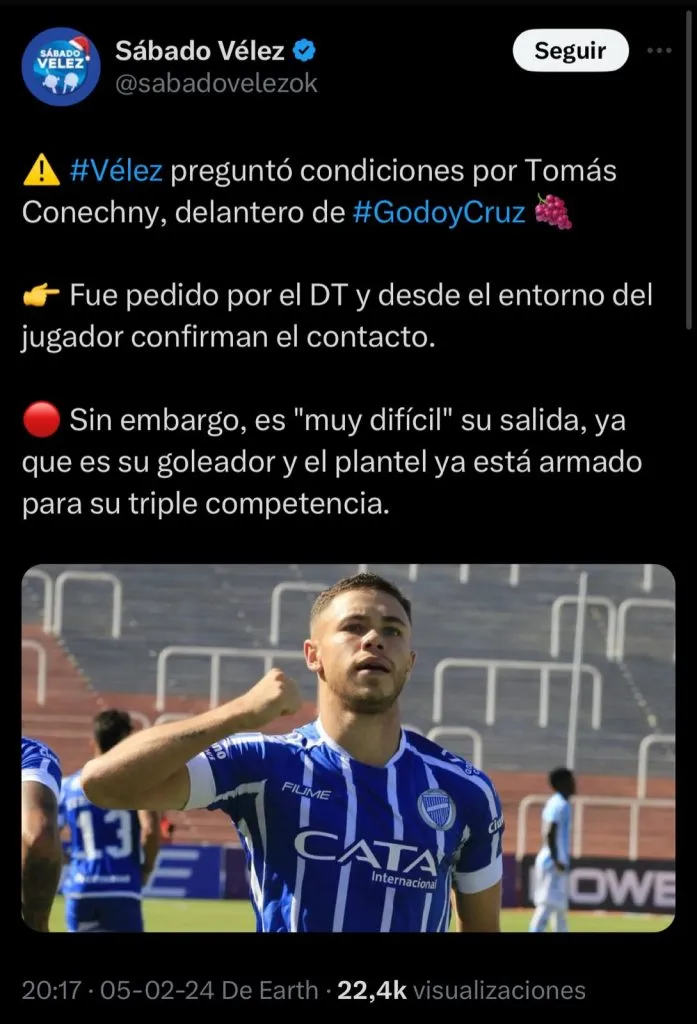 Según informó el sitio partidario del conjunto del ‘Fortín’, ‘Sábado Vélez’, los atacantes de Godoy Cruz, Tomás Conechny y Salomón Rodríguez están en la lista de posibles fichajes para el equipo de Quinteros.