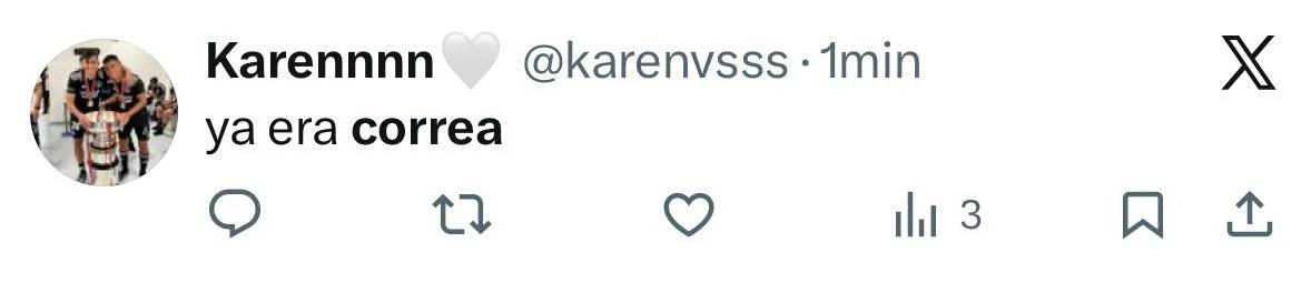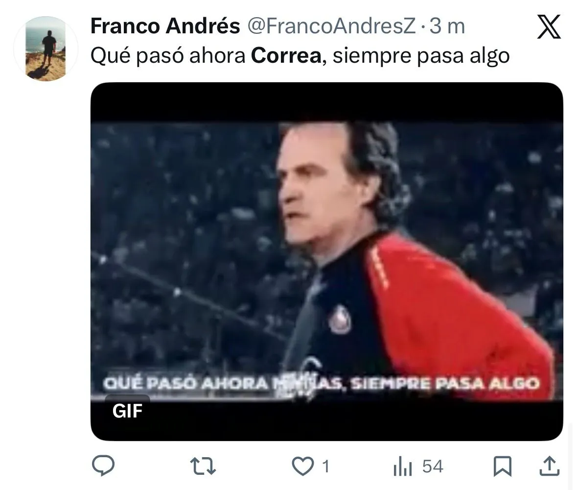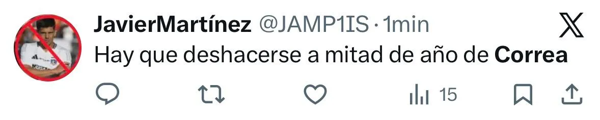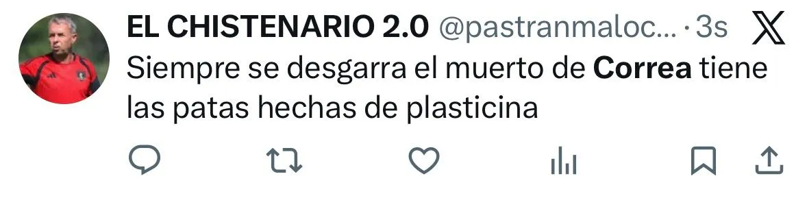 “Siempre se desgarra, tiene las patas hechas de plasticina”; “Hay que deshacerse a mitad de año de Correa”; “Qué pasó ahora Correa, siempre pasa algo”; “Correa más lesiones que goles”; “Cada dos partidos se lesiona”, fueron parte de los comentarios que se pudieron leer en X (ex Twitter).