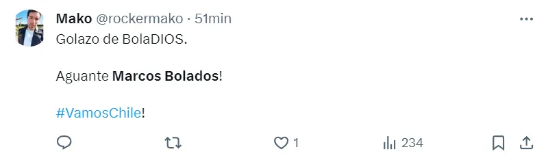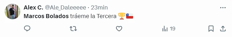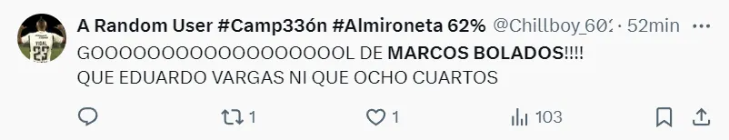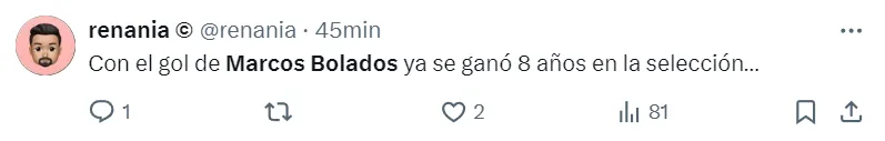 Pero también hubo parte de los seguidores colocolinos que se alegraron por esta anotación del ex Deportes Antofagasta: “Marcos Bolados tráme la tercera (Copa América)”, “Marcos Bolados, mi padre”, “con Marcos Bolados de 9 no paramos hasta el Mundial” y “Marcos Bolados, no traten de entenderlo, solo disfrútenlo”.