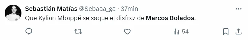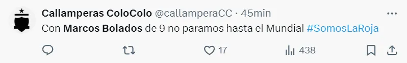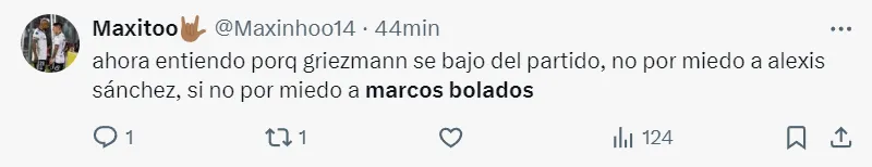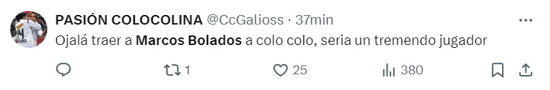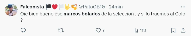 “Oye que es bueno ese Marcos Bolados de la Selección. ¿Y si lo traemos a Colo Colo?”, “Ojalá traer a Marcos Bolados a Colo Colo, sería un tremendo jugador”, “Que Kylian Mbappé se saque el disfraz de Marcos Bolados”, fueron algunos de los comentarios en ese estilo.