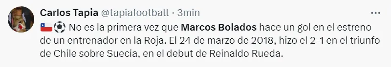 Con este tanto, Bolados convirtió su segundo gol por Chile, ya que en 2018 en el estreno de Reinaldo Rueda en la banca de La Roja, también había anotado en la victoria por 2-1 ante Suecia.