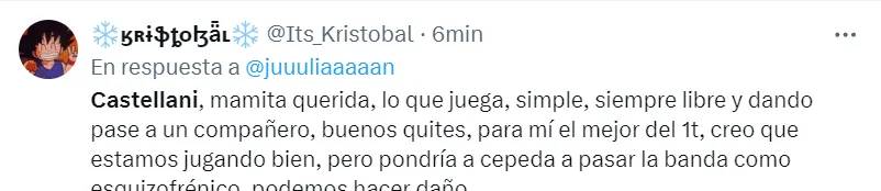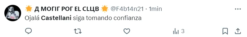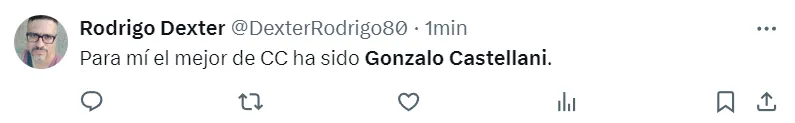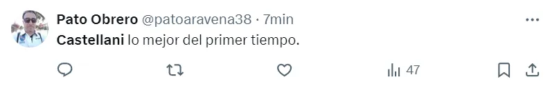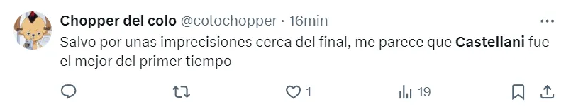 “Para mí el mejor ha sido Gonzalo Castellani”, “ojalá Castellani siga tomando confianza”, “Castellani lo mejor del primer tiempo”, “mamita querida, lo que juega”, fueron parte de los comentarios de los seguidores albos.