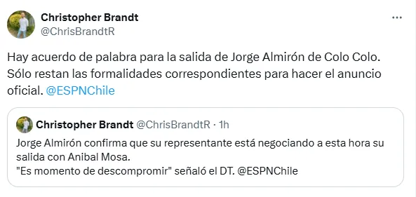“Hay acuerdo de palabra para la salida de Jorge Almirón de Colo Colo. Sólo restan las formalidades correspondientes para hacer el anuncio oficial”, señaló el comunicador a través de su cuenta de X.