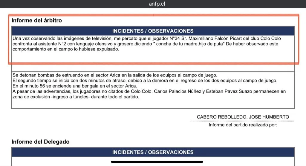 “Una vez observando las imágenes de televisión, me percato que el jugador N°34 Sr. Maximiliano Falcón Picart del club Colo Colo confronta al asistente N°2 con lenguaje ofensivo y grosero”, parte indicando el informe de Cabero.