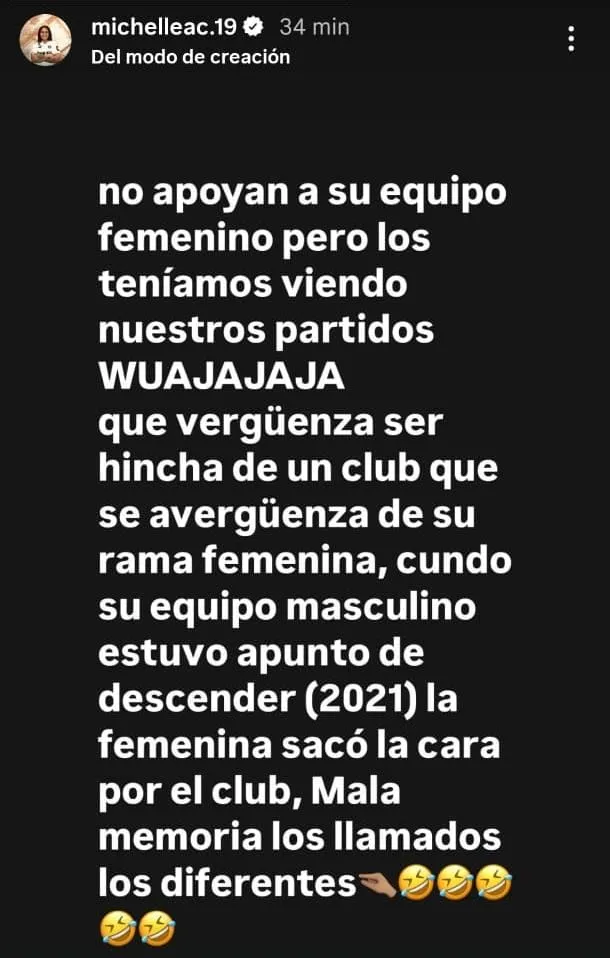 Se trata de la defensa Michelle Olivares, formada y campeona con Universidad de Chile, quien lanzó un furioso descargo en una historia de Instagram, dejando entrever su enojo contra los hinchas de su ex club.