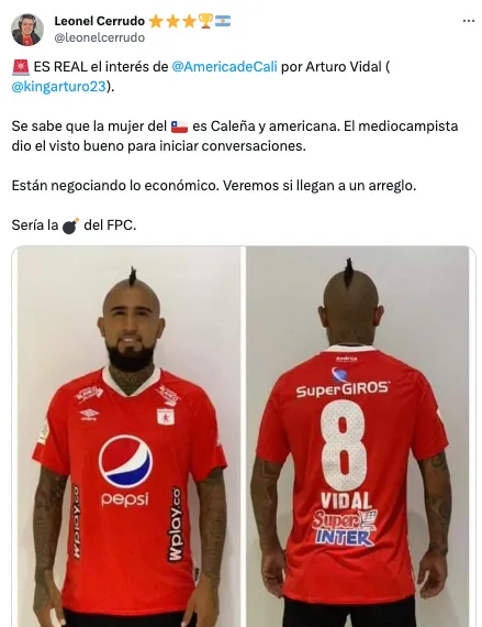 “La mujer del chileno es Caleña y Americana. El mediocampista dio el visto bueno para iniciar conversaciones. Están negociando lo económico”, aseguró en X. Incluso empezó a vitalizarse la imagen de Vidal con la camiseta del Cali. Postal que es real pero que se remonta al año 2019.