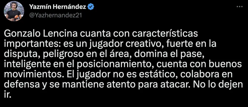 La periodista de Win Sports, Yazmín Hernández, está en la cobertura del Bucaramanga y entregó varios detalles sobre el delantero. “Gonzalo Lencina cuanta con características importantes: es un jugador creativo, fuerte en la disputa, peligroso en el área, domina el pase, inteligente en el posicionamiento, cuenta con buenos movimientos”, expresó.