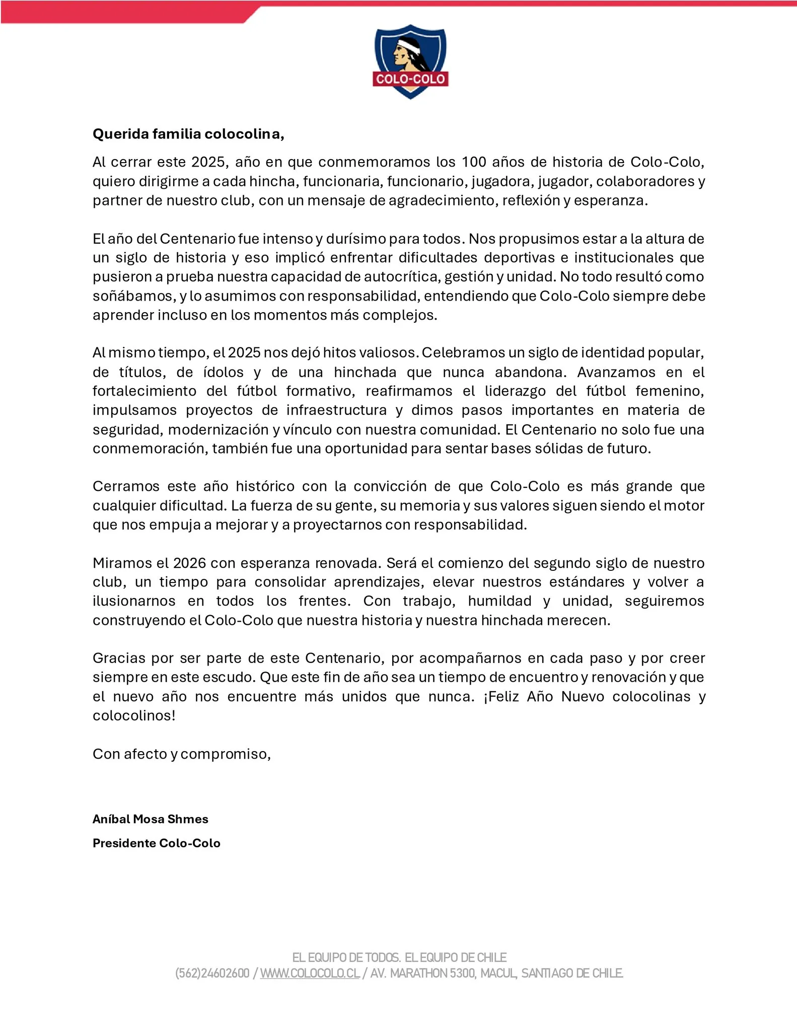 Miramos el 2026 con esperanza renovada. Será el comienzo del segundo siglo de nuestro club, un tiempo para consolidar aprendizajes, elevar nuestros estándares y volver a ilusionarnos en todos los frentes. Con trabajo, humildad y unidad, seguiremos construyendo el Colo Colo que nuestra historia y nuestra hinchada merecen”, completó el empresario de origen sirio.