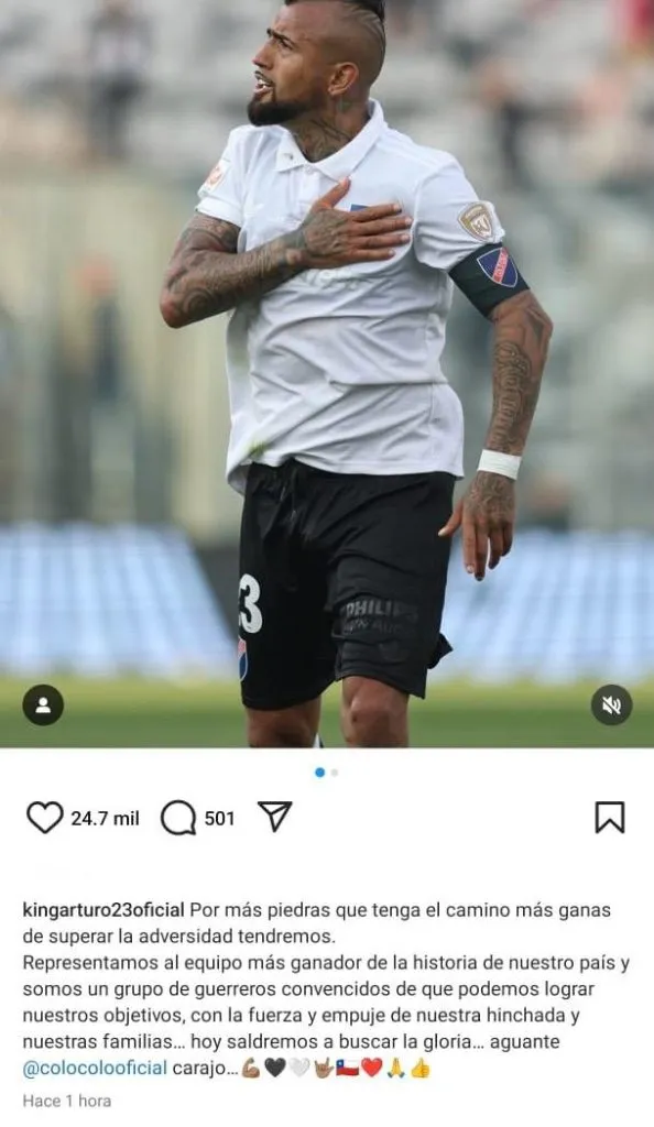 “Por más piedras que tenga el camino, más ganas de superar la adversidad tendremos. Representamos al equipo más ganador de la historia de nuestro país y somos un grupo de guerreros convencidos de que podemos lograr nuestros objetivos, con la fuerza y empuje de nuestra hinchada y nuestras familias. Hoy saldremos a buscar la gloria. Aguante Colo Colo carajo“, escribió Vidal.