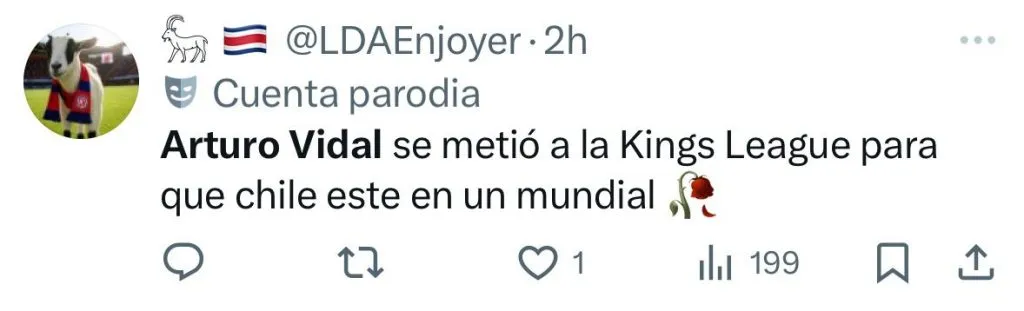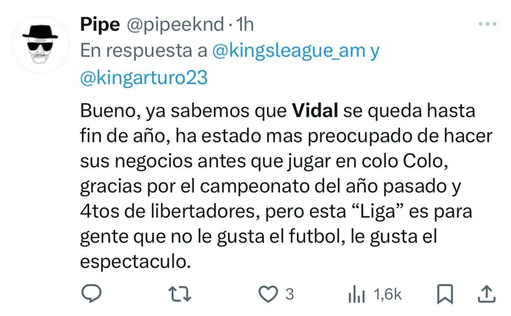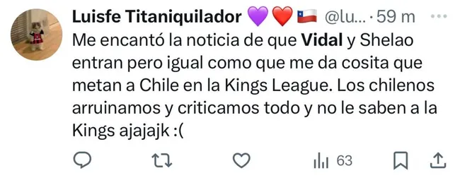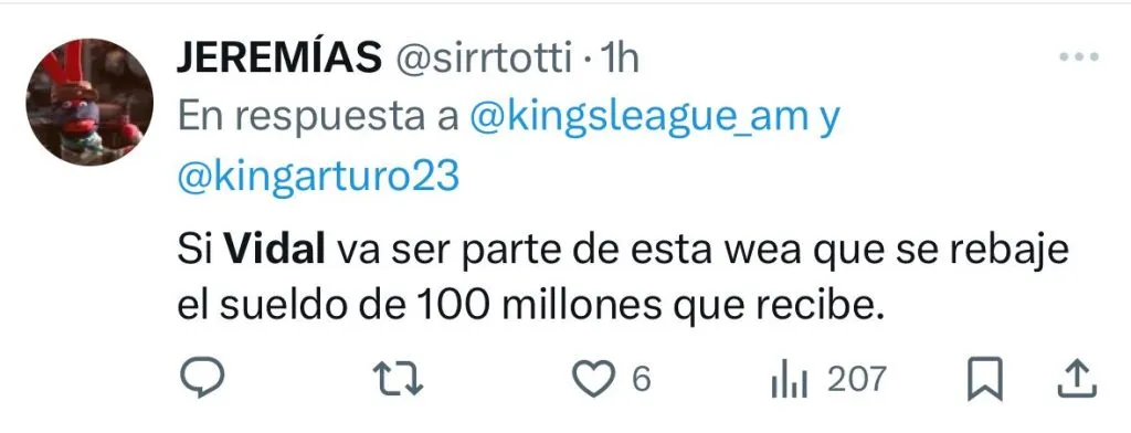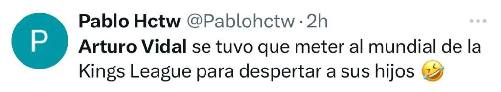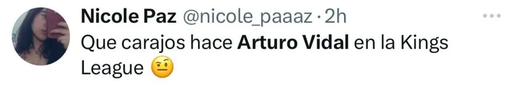 “Arturo Vidal se tuvo que meter al Mundial de la Kings League para despertar a sus hijos”, “Arturo Vidal se metió a la Kings League para que Chile esté en un Mundial”, “Qué carajos hace Arturo Vidal en la Kings League”, fueron parte de los comentarios en el antes llamado Twitter.