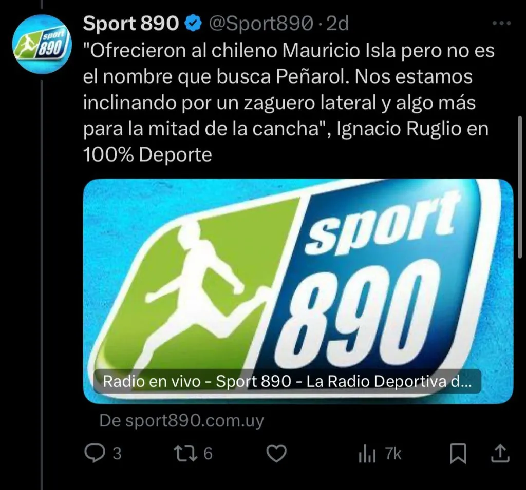 Así lo confirmó su mismo presidente, Ignacio Ruglio en conversación con ‘100% Deporte’ de Sport 890 en Uruguay “ofrecieron al chileno Mauricio Isla pero no es el nombre que busca Peñarol. Nos estamos inclinando por un zaguero lateral y algo más para la mitad de la cancha”.