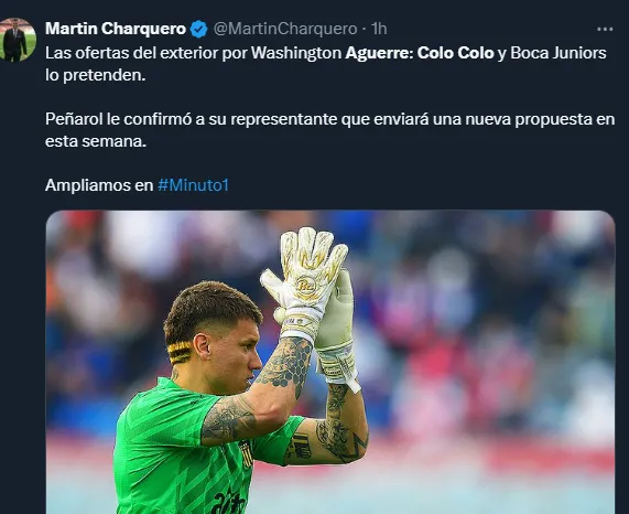 “Las ofertas del exterior por Washington Aguerre: Colo Colo y Boca Juniors lo pretenden. Peñarol le confirmó a su representante que enviará una nueva propuesta en esta semana”, declaró.