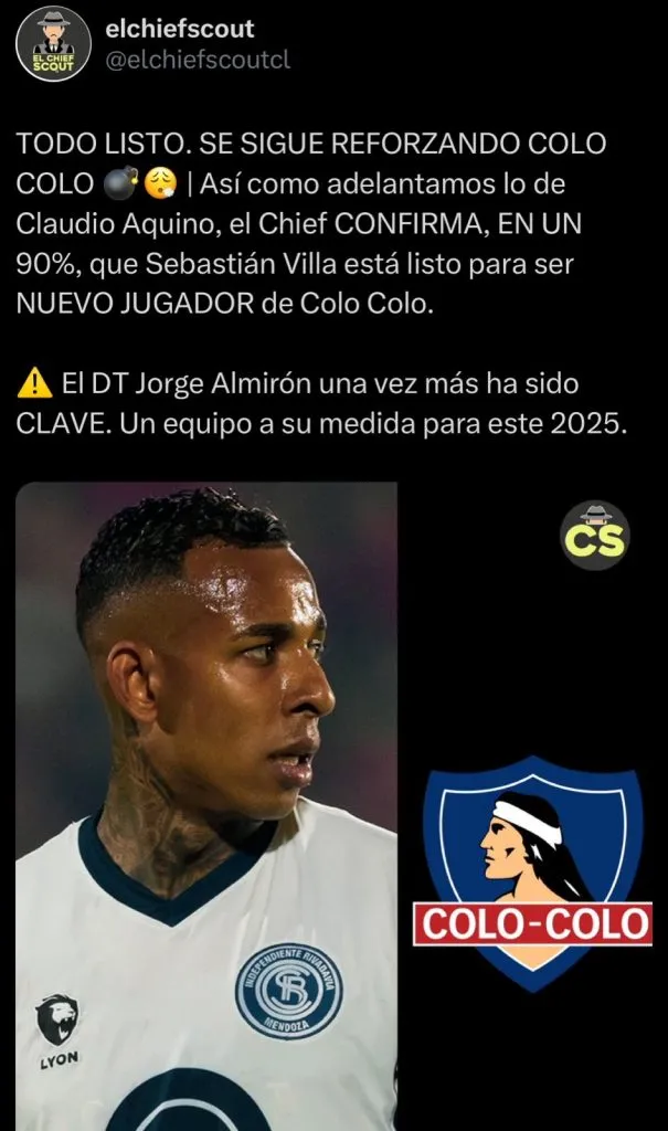 “Todo listo, se sigue reforzando Colo Colo. Así como adelantamos lo de Claudio Aquino, el Chief confirma en un 90% que Sebastián Villa está listo para ser nuevo jugador de Colo Colo. El DT Jorge Almirón una vez más ha sido clave”, informaron.