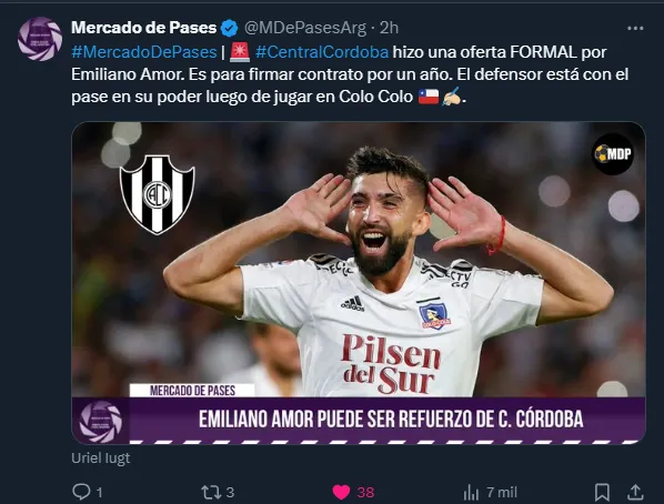 “Central Córdoba hizo una oferta formal por Emiliano Amor. Es para firmar contrato por un año. El defensor está con el pase en su poder luego de jugar en Colo Colo”, informaron.