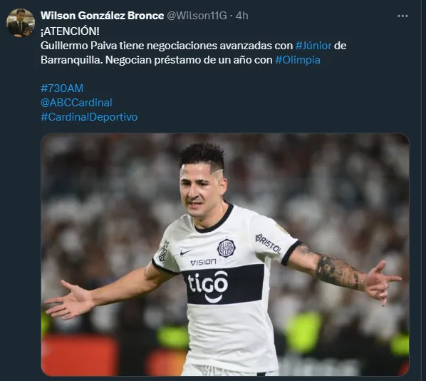 “¡Atención! Guillermo Paiva tiene negociaciones avanzadas con Junior de Barranquilla. Negocian préstamo de un año con Olimpia”, indicó el comunicador.