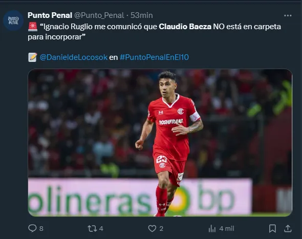 Ignacio Ruglio me comunicó que Claudio Baeza no está en carpeta para incorporar”, fue lo que señaló.