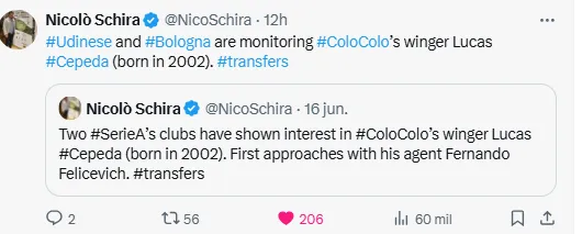 Hace unas horas, el periodista Nicoló Schira reveló en su cuenta de ‘X’ los dos equipos del fútbol italiano que buscan el fichaje de Lucas Cepeda en este mercado de pases: Udinese y Bologna.