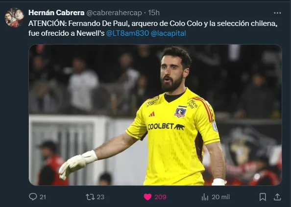Esta información fue entregada por el periodista argentino, Hernán Cabrera en su cuenta de ‘X’, en la que señala que el nombre del hoy portero de Colo Colo fue ofrecido al conjunto argentino para la temporada 2025.
