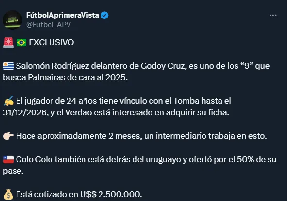 “Salomón Rodríguez delantero de Godoy Cruz, es uno de los “9” que busca Palmeiras de cara al 2025. El jugador de 24 años tiene vínculo con el Tomba hasta el 31/12/2026, y el Verdāo está interesado en adquirir su ficha. Hace aproximadamente 2 meses, un intermediario trabaja en esto”, informó.