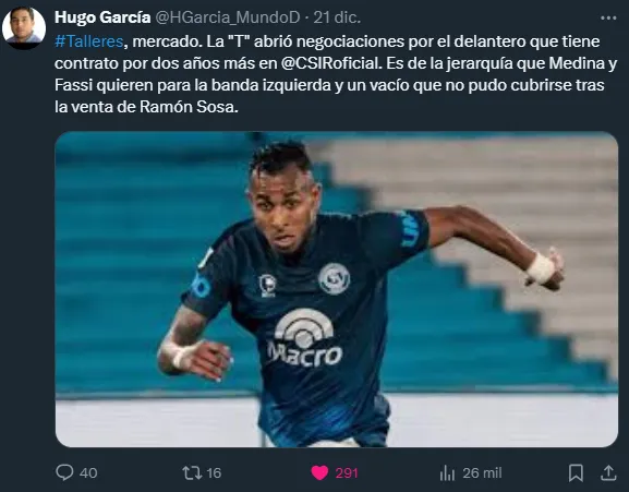 Esta información fue compartida por el periodista, Hugo García en su cuenta de ‘X’ en la que indicó ‘La ‘T’ abrió negociaciones por el delantero que tiene contrato por dos años más en Independiente de Rivadavia. Es de la jerarquía que Medina y Fassi quieren para la banda izquierda y un vacío que no pudo cubrirse tras la venta de Ramón Sosa’.