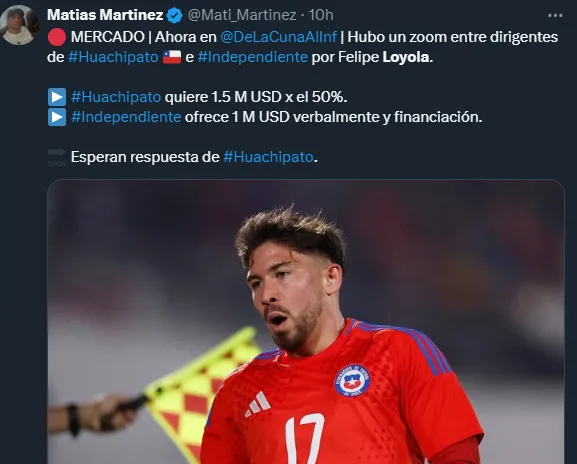 “Hubo un zoom entre dirigentes de Huachipato e Independiente por Felipe Loyola. Huachipato quiere 1.5 M USD x el 50% e Independiente ofrece 1 M USD verbalmente y financiación”, declaró el comunicador.