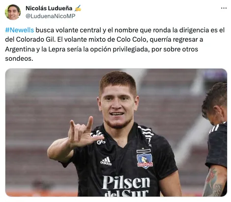 El periodista argentino Nicolás Ludueña lanzó la información a través de su cuenta de Twitter. “Newells busca volante central y el nombre que ronda la dirigencia es el del Colorado Gil. El volante mixto de Colo Colo, querría regresar a Argentina y la Lepra sería la opción privilegiada, por sobre otros sondeos”, recalcó.