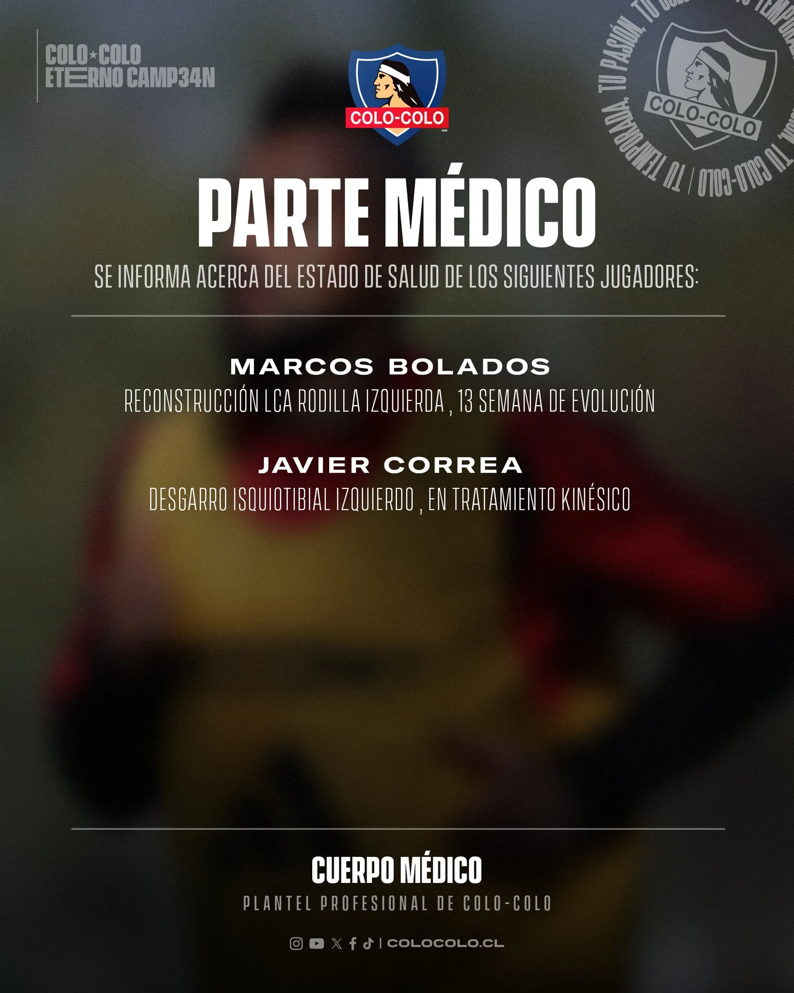 Por otro lado, Colo Colo informó la situación de Javier Correa la que genera una luz de esperanza, aunque para este domingo está totalmente descartado. El atacante argentino sufrió un desgarro en el isquiotibial izquierdo tras el duelo ante Huachipato, resintiéndose de una dolencia previa que ya lo había complicado ante los “Cementeros”. El último informe detalla que el jugador continúa bajo estricto tratamiento kinésico.
