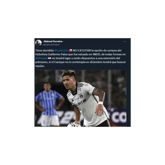 Según señalaron en Radio ADN, Olimpia no está interesado en la vuelta de Paiva, por lo que harían un importante esfuerzo para que se mantenga en Colo Colo. ¿El esfuerzo? el club paraguayo rebajaría la clausula de compra a Colo Colo, la que bajaría de 1,2 a 900 mil.