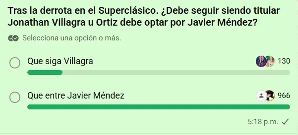 De acuerdo con los votos registrados, 966 aficionados eligieron a Javier Méndez como titular, lo que equivale a un contundente 88,2% de las preferencias. En contraste, solo 130 votos (11,8%) respaldaron la continuidad de Jonathan Villagra en el once inicial.