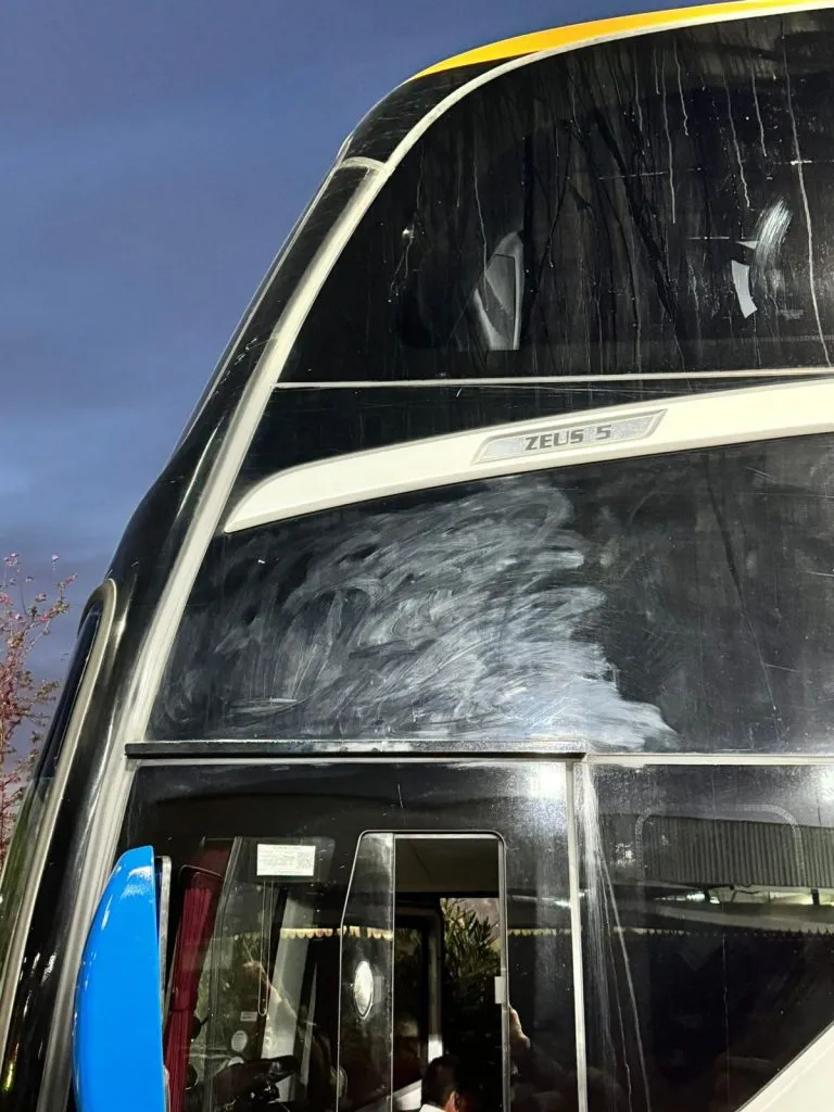 Pues bien, según informa la prensa argentina, se reporta que el bus que transportaba al elenco argentino, fue atacado con piedras en su llegada al recinto del David Arellano.