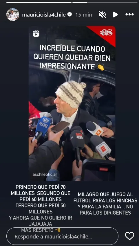 “Primero pedí que 70 millones, segundo que pedí 60 millones, tercero que pedí 50 millones y ahora que no quiero ir jajaja, más respeto”, añadió el bicampeón de América con la Roja.
