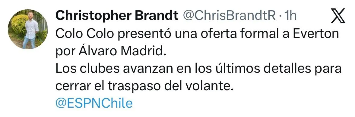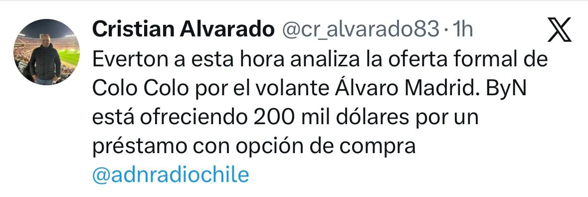 “Everton a esta hora analiza la oferta formal de Colo Colo por el volante Álvaro Madrid. ByN está ofreciendo 200 mil dólares por un préstamo con opción de compra”, publicó en X.