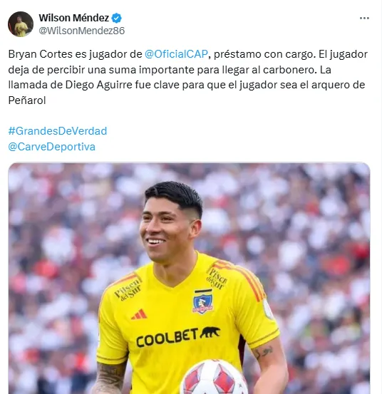 “Brayan Cortés es jugador de Peñarol, préstamo con cargo. El jugador deja de percibir una suma importante para llegar al ‘Carbonero’. La llamada de Diego Aguirre fue clave para el jugador sea el arquero de Peñarol”, señaló el periodista.