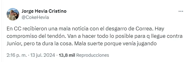 “En CC recibieron una mala noticia con el desgarro de Correa. Hay compromiso del tendón. Van a hacer todo lo posible para q llegue contra Junior, pero ta dura la cosa. Mala suerte porque venía jugando”, indicó el comunicador en su cuenta de “X”.