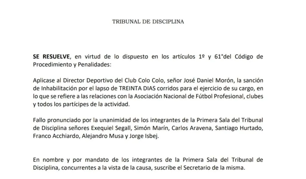 Procedimiento y Penalidades: Aplicase al Director Deportivo del Club Colo Colo, señor José Daniel Morón, la sanción de Inhabilitación por el lapso de TREINTA DIAS corridos para el ejercicio de su cargo, en lo que se refiere a las relaciones con la Asociación Nacional de Fútbol Profesional, clubes y todos los partícipes de la actividad”.