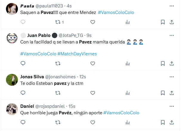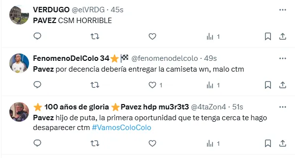 “Colo Colo juega pésimo. Y Pavez se lo sacan como si nada, un enganche y se muere”, o también: “Es muy malo Esteban Pavez, No te gana una pelota, no llega a las coberturas, es lento, entrega mal la pelota y ahora hace una falta estúpida a la entrada del área”.