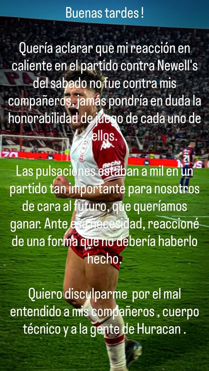 “Las pulsaciones estaban a mil en un partido tan importante para nosotros de cara al futuro, que queríamos ganar. Ante esa necesidad, reaccioné de una forma que no debería haberlo hecho. Quiero disculparme por el mal entendido a mis compañeros, cuerpo técnico y a la gente de Huracán”, declaró.