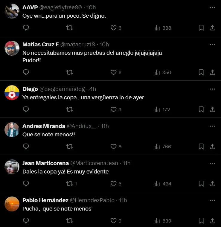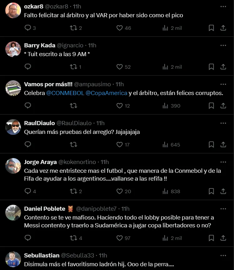 Rápidamente este tuit se llenó de comentarios de los fanáticos chilenos, quienes aprovecharon la instancia para sacarle en cara las polémicas jugadas y el arbitraje del juez central charrúa.