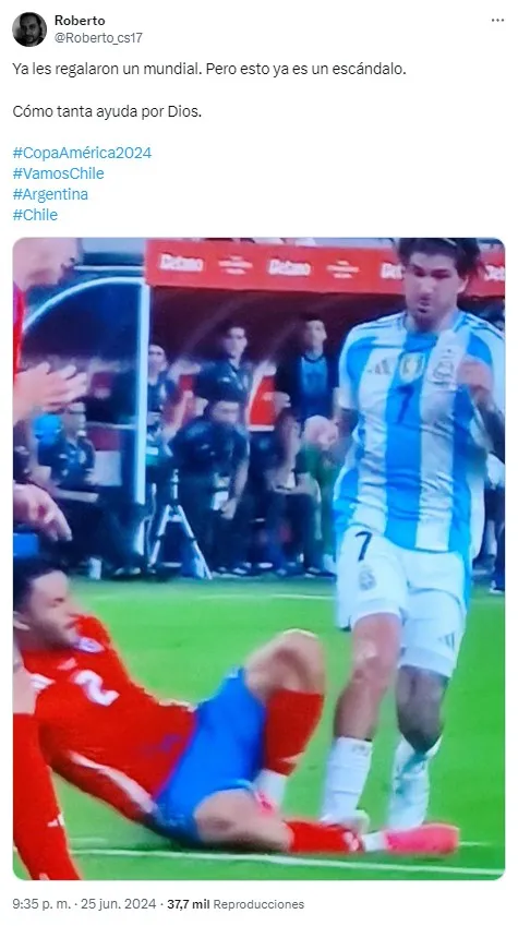 Y, minutos más tardes, la pelota se fue en la disputa con la zona defensiva de Chile. El esférico quedó sin rumbo fuera del área nacional, la cual sería aprovechada por Rodrigo De Paul, pero que no contó con que Gabriel Suazo iría al cruce para evitar el remate. Sin embargo, el defensor del Toulouse recibió un pisotón por parte del volante, que ni siquiera fue sancionado como falta.