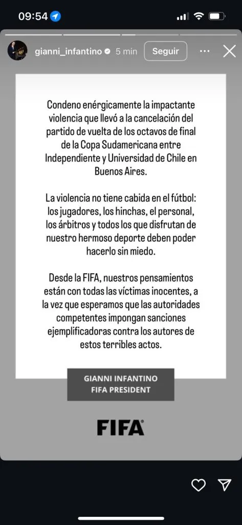 “Condeno enérgicamente la impactante violencia que llevó a la cancelación del partido de vuelta de los octavos de final de la Copa Sudamericana entre Independiente y Universidad de Chile en Buenos Aires”, parte señalando Infantino.