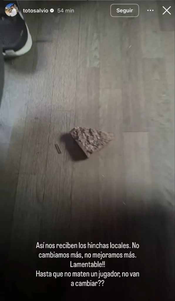 Fue Eduardo ‘Toto’ Salvio quien subió una historia en Instagram con la imagen de la piedra que impactó al bus. “Así nos reciben los hinchas locales. No cambiamos más, no mejoramos más. Lamentable!! Hasta que no maten a un jugador no van a cambiar”, lanzó.