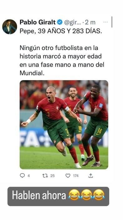 El formado en Colo Colo se colgó de un tuit del periodista argentino Pablo Giralt que rezaba: “Pepe, 39 años y 283 días. Ningún otro futbolista en la historia marcó a mayor edad en una fase mano a mano del Mundial”. ¿La respuesta de Vidal?: “Hablen ahora”.