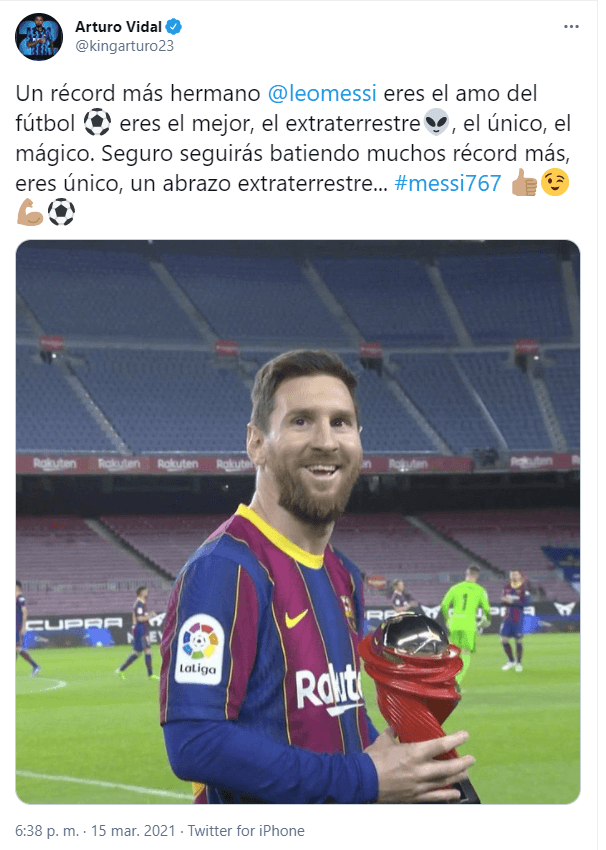 “Un récord más hermano Lionel Messi eres el amo del fútbol, eres el mejor, el extraterrestre, el único, el mágico. Seguro seguirás batiendo muchos récords más, eres único, un abrazo extraterrestre”, publicó Vidal en su cuenta de Twitter.
