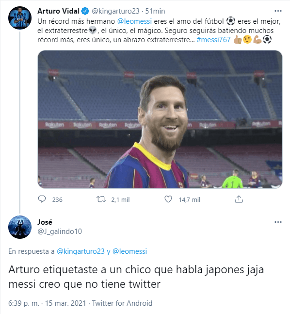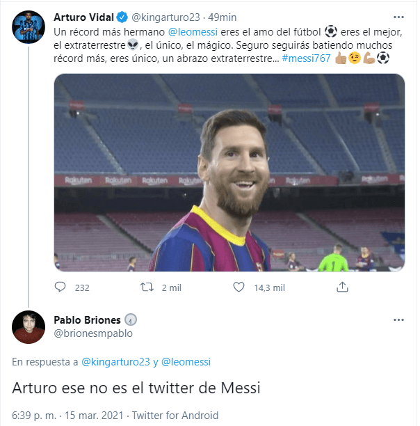 Fueron varios los seguidores de Vidal quienes le hicieron saber de su error, señalándole que no era la cuenta de Lionel Messi y que se había equivocado al etiquetarlo en Twitter.