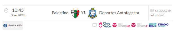La ANFP confirmó que el encuentro que irá por las pantallas de Chilevisión será el duelo entre Palestino y Deportes Antofagasta, que se disputará este domingo 28 de marzo a partir de las 10:45 horas y que se jugará en el Estadio Municipal de La Cisterna.