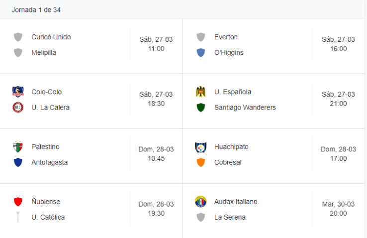 El único equipo que no tendrá acción deportiva para esta primera fecha del campeonato será la Universidad de Chile, considerando que son 17 equipos los que participarán de este certamen competitivo.